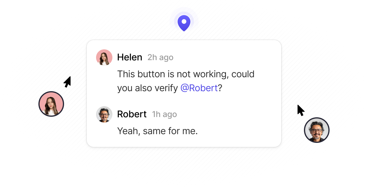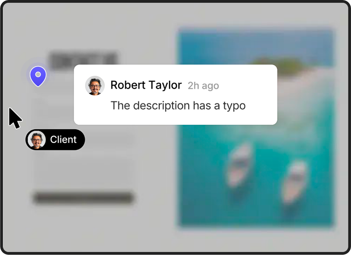 Clients see existing feedback as pins to reduce duplicates, then use comments, mentions, and tags to collaborate and avoid confusion.