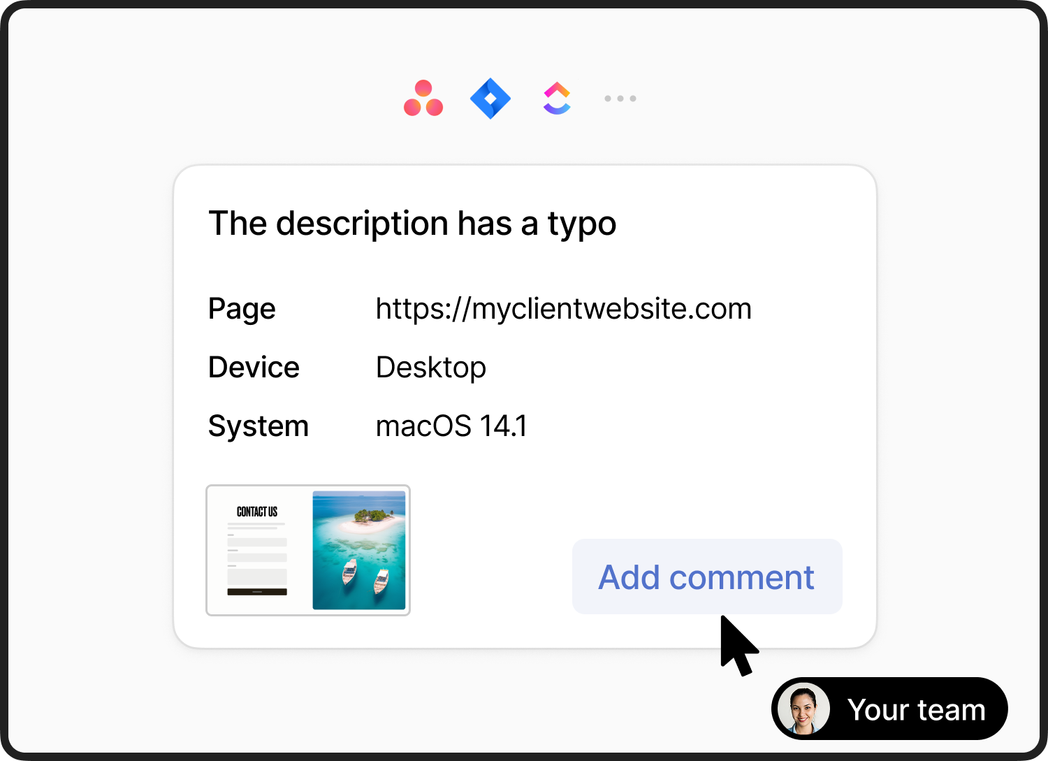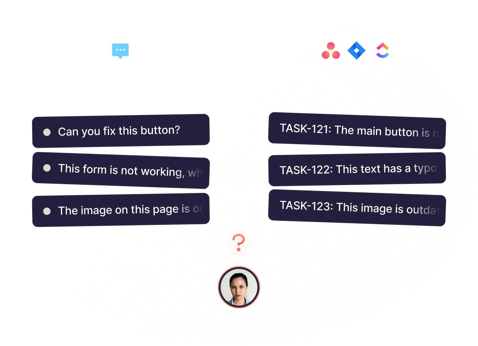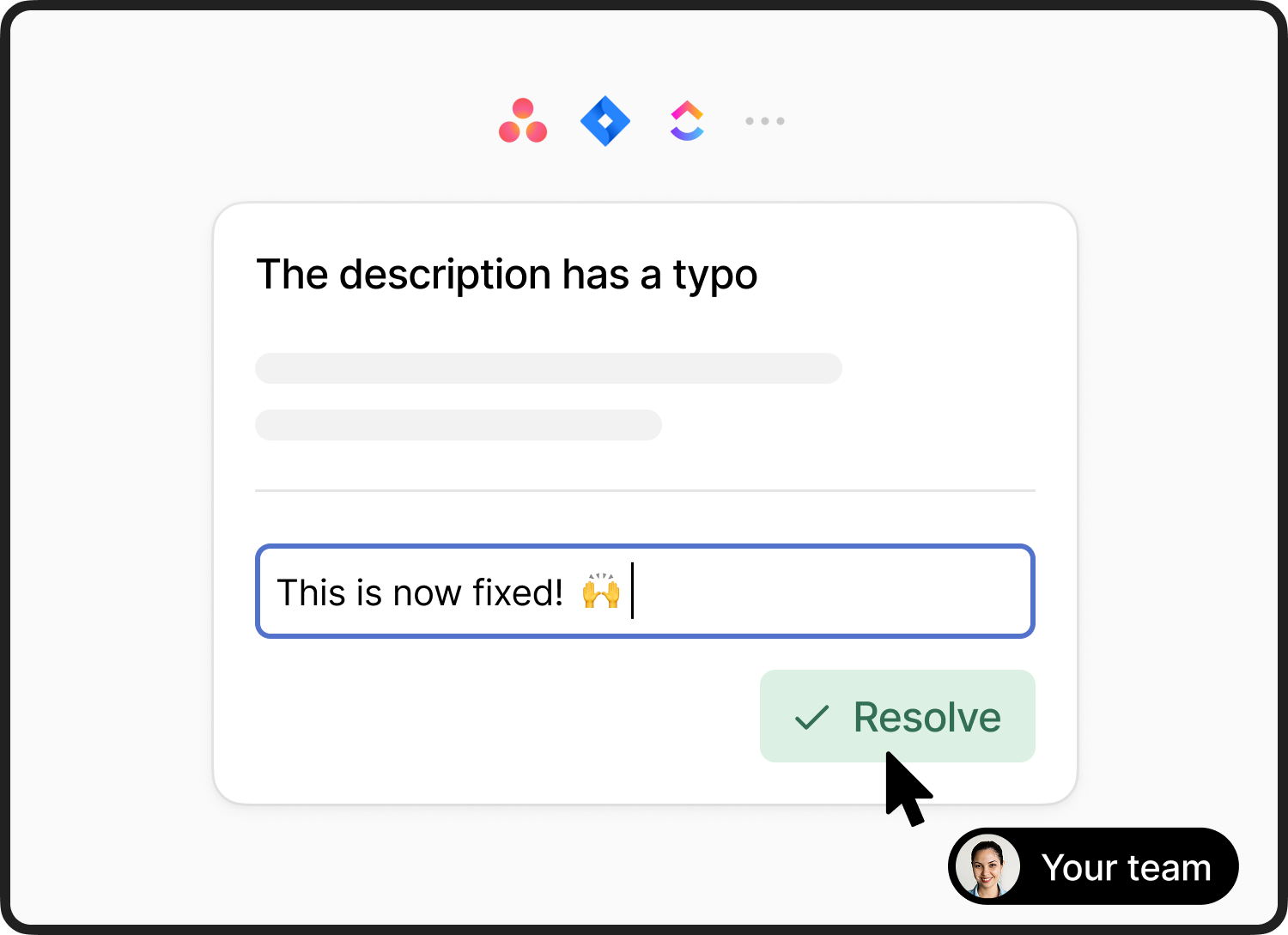 Each comment becomes a task inside Asana, Clickup, Jira, etc. Ask follow-up questions or resolve feedback without leaving your project management software or changing workflows.