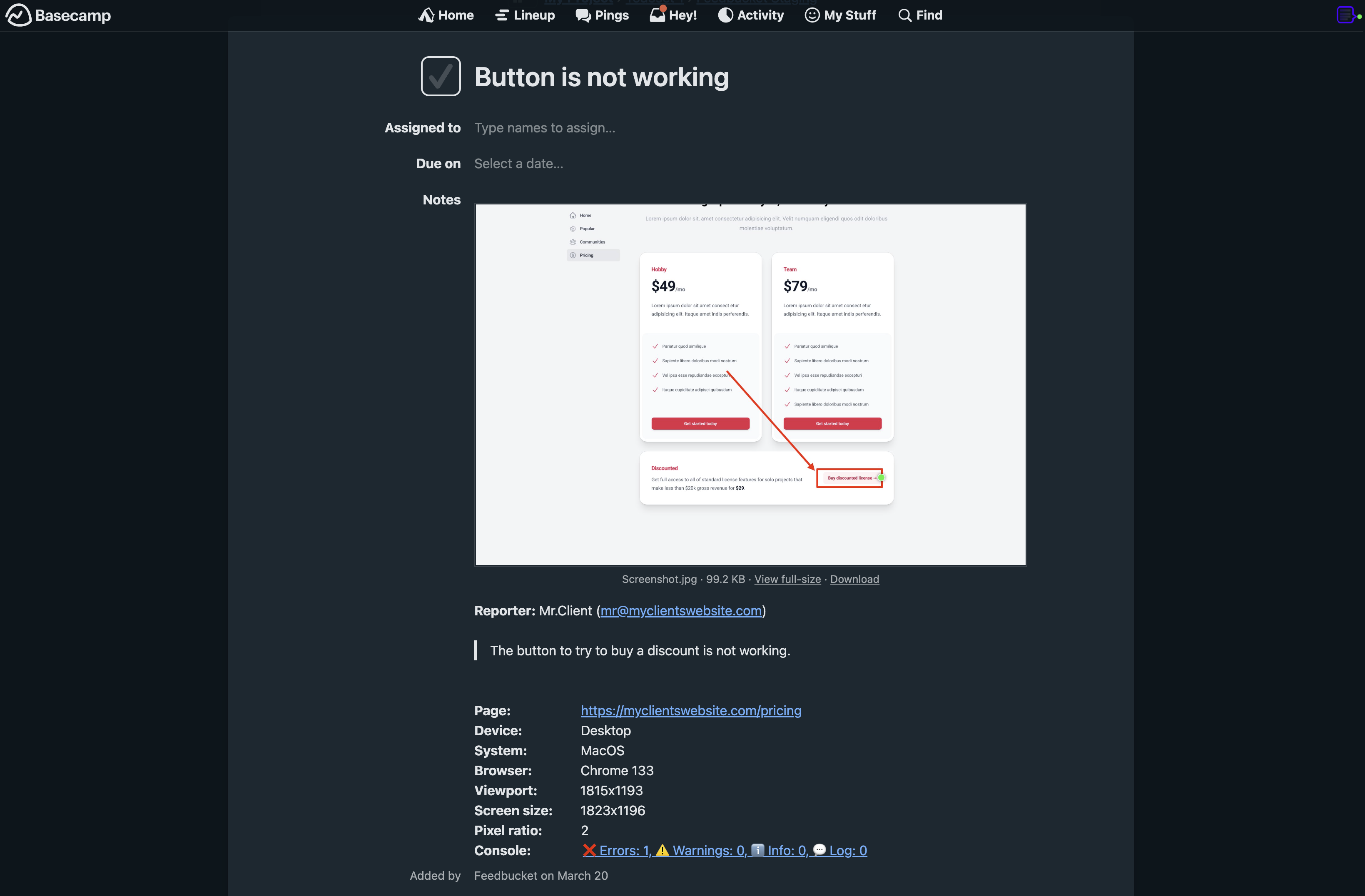 Get all the information that's needed to start working on the issue directly in Basecamp. Technical information and screenshot are automatically added by Feedbucket to your Basecamp to-do.
