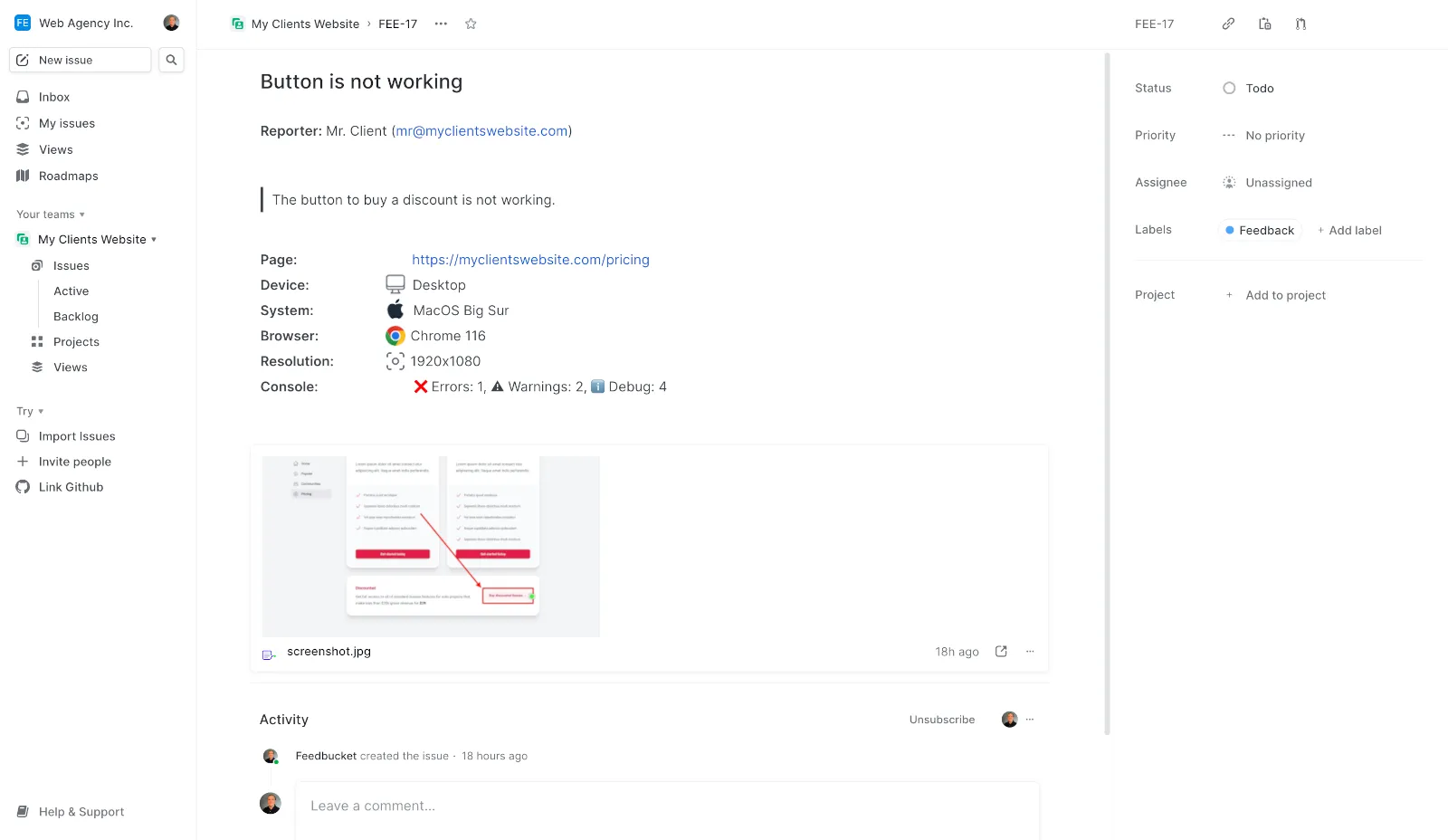 Get all the information that's needed to start working on the issue directly in Linear. Technical information and screenshot are automatically added by Feedbucket to your Linear issues.