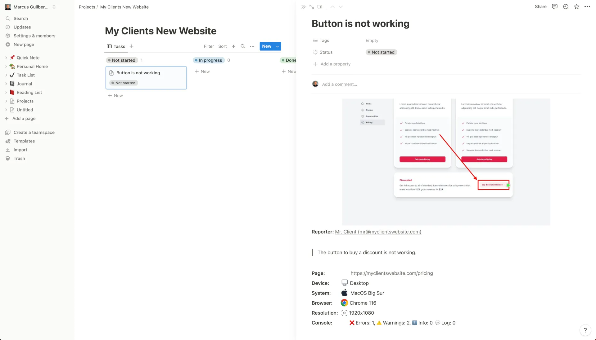 Feedback is automatically created as a page in Notion. It contains all the the information your developers need.