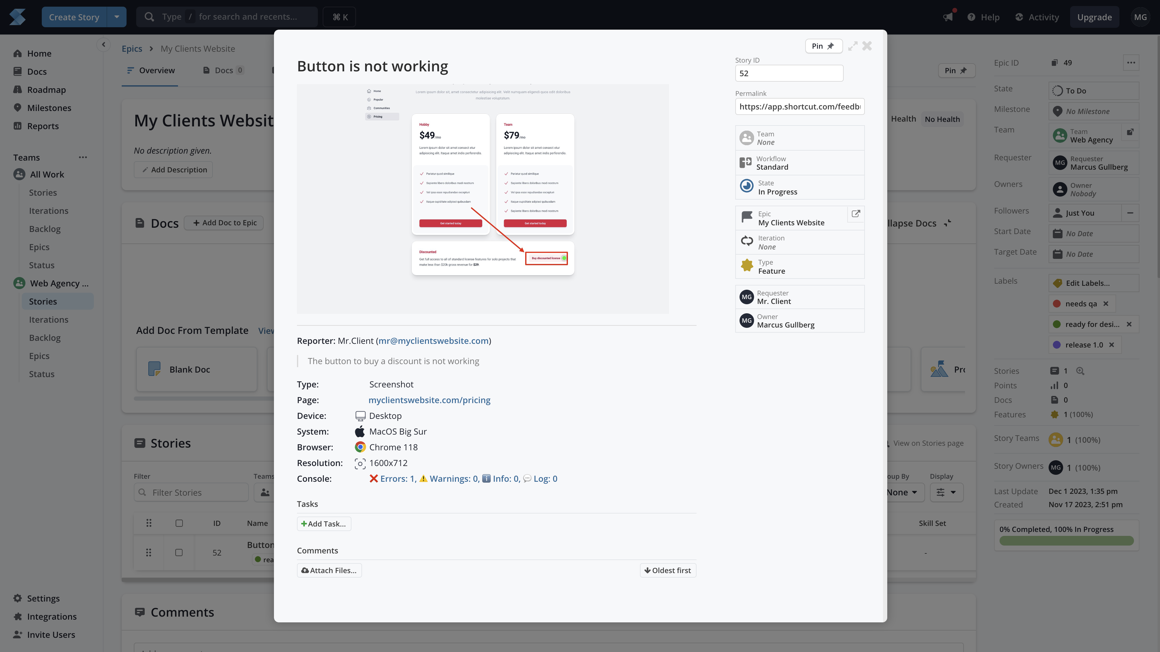 Feedback is automatically created as a story in Shortcut. It contains all the the information your developers need.